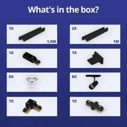 | Nome del fabbricante | Complete L shaped 1-Phase Track Set Black incl. 8x Spot fixture + GU10 2700K 3W Dim – 1,5 x 2 meter | |