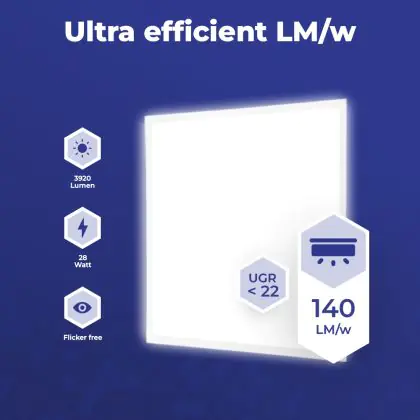 Questo pannello LED di Noxion ha dimensione 60x60cm, che lo rende perfetto da montare in un soffitto a griglia, ma può anche essere montato a superficie con degli accessori appositi. Inoltre consuma solo 28 W ma ha una potenza luminosa di 3920 lm, il che lo rende un perfetto sostituto dei tubi fluorescenti 4x18 W. I costi energetici saranno fino al 70% più bassi rispetto a un apparecchio convenzionale.