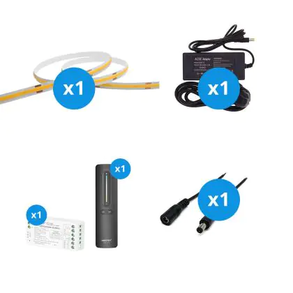 Il grande vantaggio di questo kit completo è che include tutti gli accessori necessari per installare il nastro LED a casa o in azienda. Vi forniamo il materiale necessario per installare il nastro LED. Poi si collega il tutto a una presa elettrica standard. Troverete tutte le informazioni necessarie nel nostro blog sull'installazione. Il kit comprende: