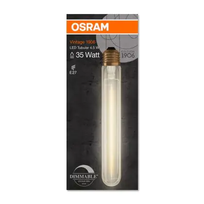 La Osram Vintage 1906 LED E27 Tubular Filamento Oro 4.5W 400lm - 824 Bianco Molto Caldo | Dimmerabile - Sostitutiva 40W è la perfetta sostituzione per la tua lampada convenzionale 35W con attacco E27 grazie alla sua tecnologia LED. Passare a LED ti offrirà tanti vantaggi!