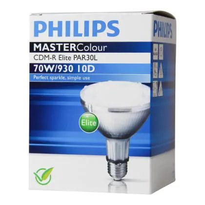 Le Philips CDM-R Elite 70W 930 E27 PAR30L 10D (MASTERColour) sono lampade a scarica compatte ad alogenuri metallici in ceramica dotate di riflettore. Sono lampade estremamente efficienti che presentano una potenza di 70W e sono dotate di attacco del tipo E27. Queste lampade a scarica compatte hanno una vita media di 15000 ore. La resa dei colori é eccezionale grazie all'indice di resa cromatica di 90-100Ra: questo sta ad indicare che le caratteristiche degli oggetti illuminati sono poste in risalto in maniera ottimale.